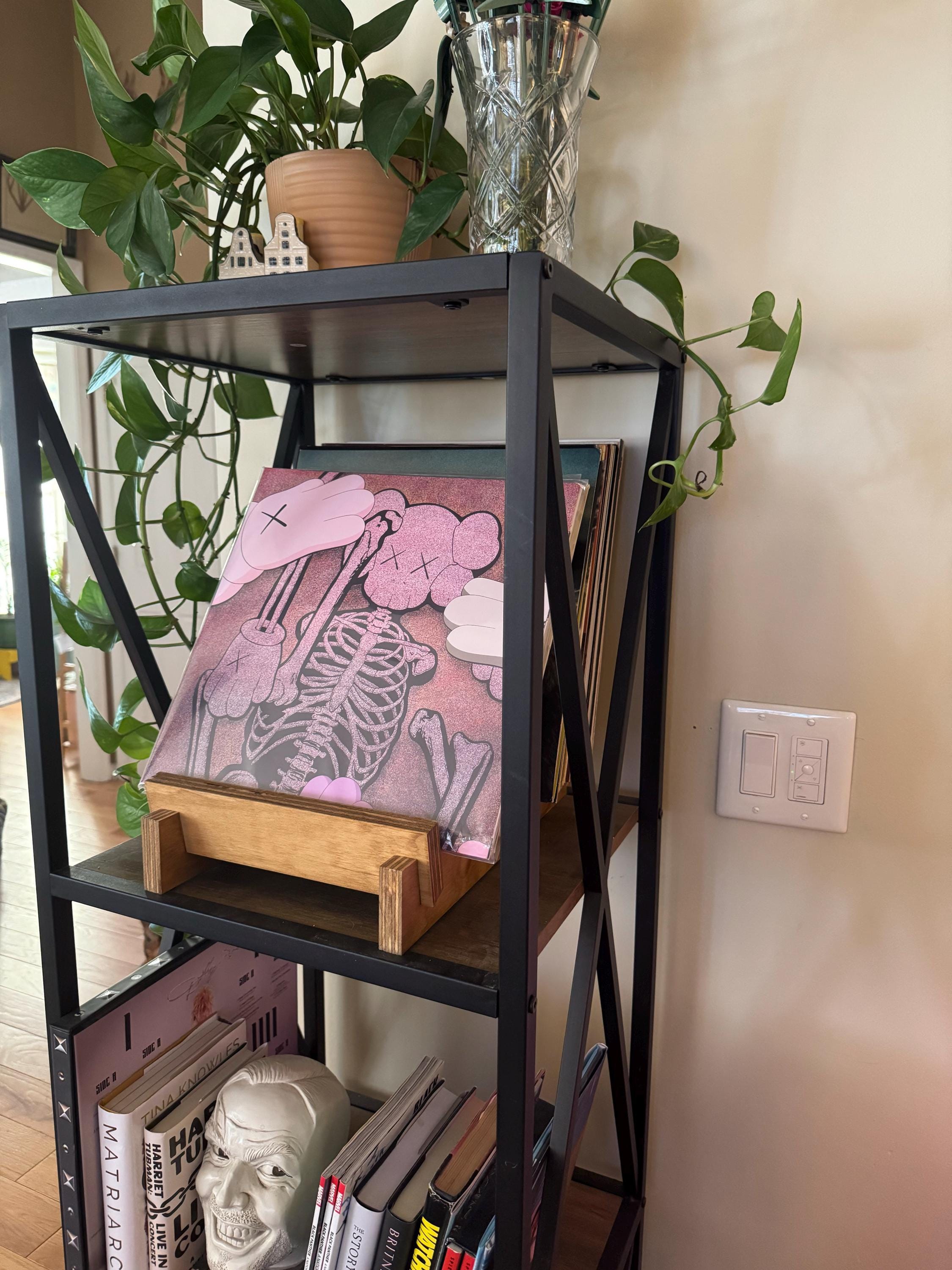 Handmade in the USA, this four-piece vinyl album display rack is the perfect way to store and display your record albums. Easy to assemble, no tools or screws needed. Free Shipping!